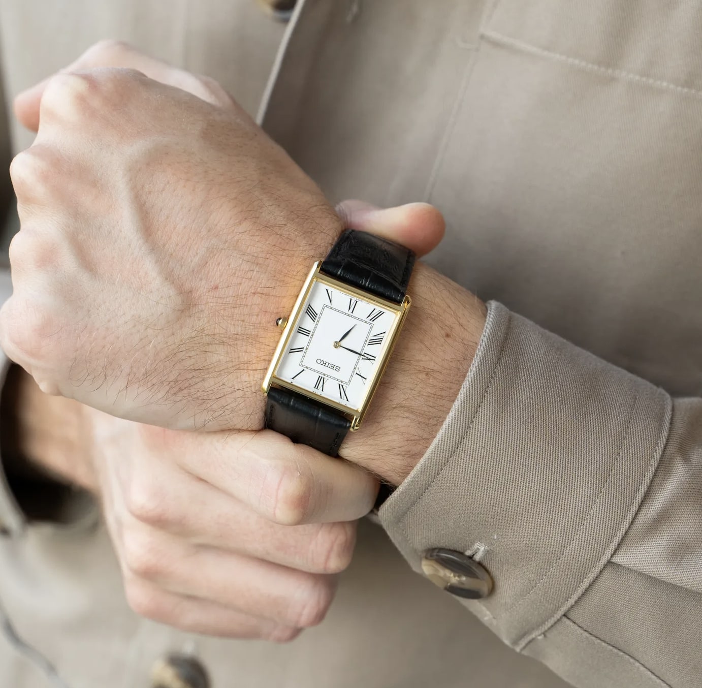 It’s a rectangular, dress-style watch with a clean dial and slim profile. It just looks right with a suit and doesn’t feel out of place with a button-down either. The price is around $300, which honestly feels low once you see it in person. If I hadn’t checked the tag, I would have guessed much higher.